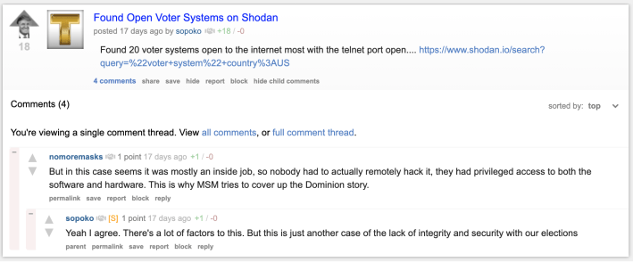 OAN further stated that the discovery had been made through Shodan, a search engine for internet-connected devices, and framed the findings as evidence that election results could have been manipulated.