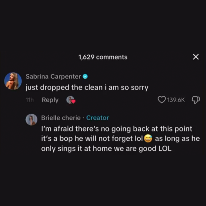 “Just dropped the clean I am so sorry,” Sabrina comments, a sentiment which alone has snagged over 419 thousand likes. That’s a woman of the people right there.
