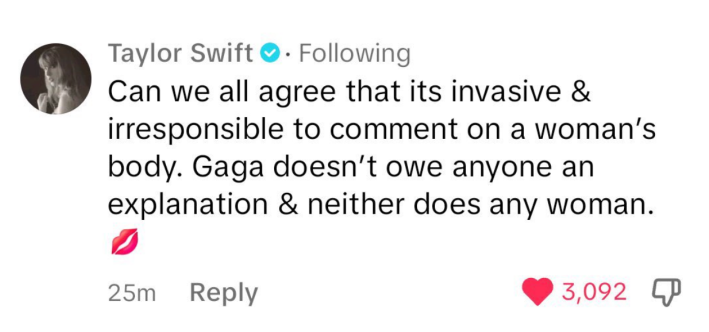 Exactly. People on TikTok praised Taylor for defending Gaga. “You spilled🙏🏻,” one person wrote. “This is why we love you so freaking much THANK YOU.”
