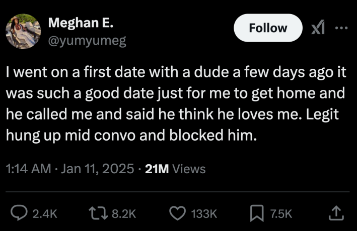 “I went on a first date with a dude a few days ago,” wrote X user @yumyumeg) in a post from Jan 11., 2025. “It was such a good date just for me to get home and he called me and said he thinks he loves me. Legit hung up mid convo and blocked him.”