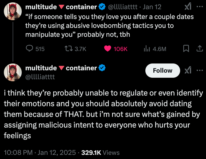 “‘If someone tells you they love you after a couple dates they’re using abusive lovebombing tactics you to manipulate you’ probably not, tbh,” posted @lllliatttt on X on Jan. 13, 2025, raking in 4.4M views and over 3.6K comments debating the statement.