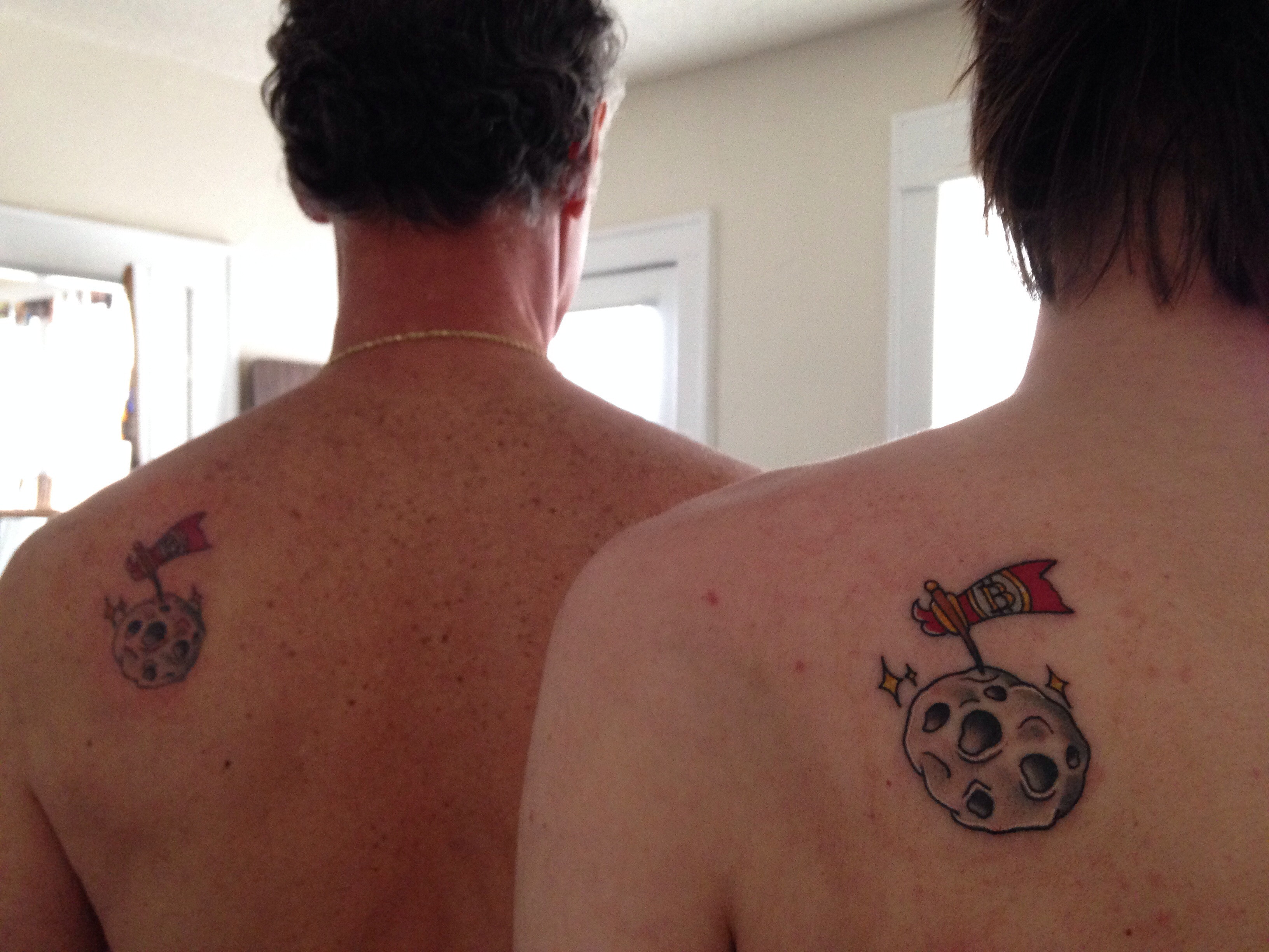 So he posted the photo of himself and his dad to Reddit's r/bitcoin: matching left shoulder tattoos of a Bitcoin flag planted on an asteroid.