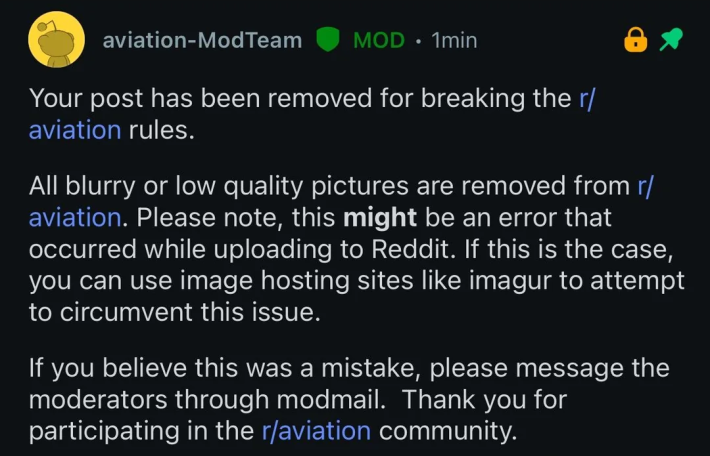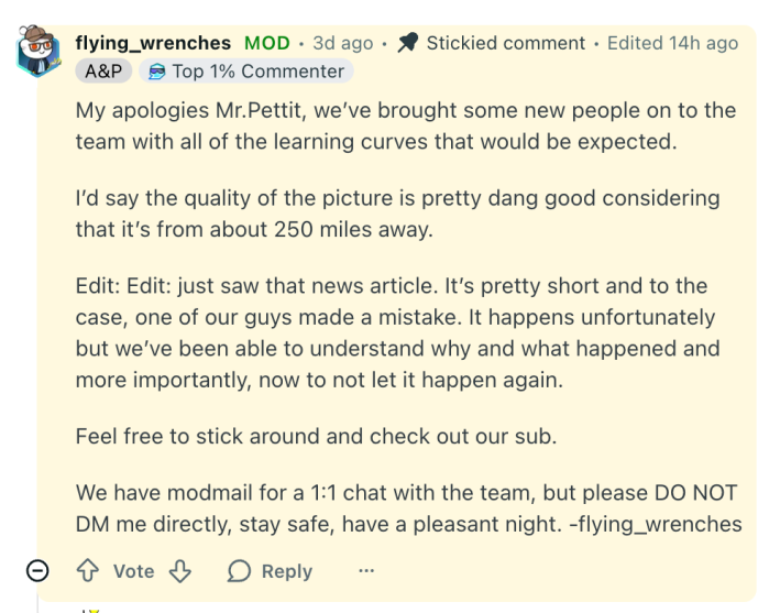 "We brought some new people onto the mod team, and unfortunately, there are some learning curves," they wrote. "I caught the issue and fixed it. Thanks to everyone who let me know that this happened. I’ll speak to the guy who made the mistake, and hopefully this won’t happen again. Quality ain’t bad when you consider the pic is 250-ish miles away."