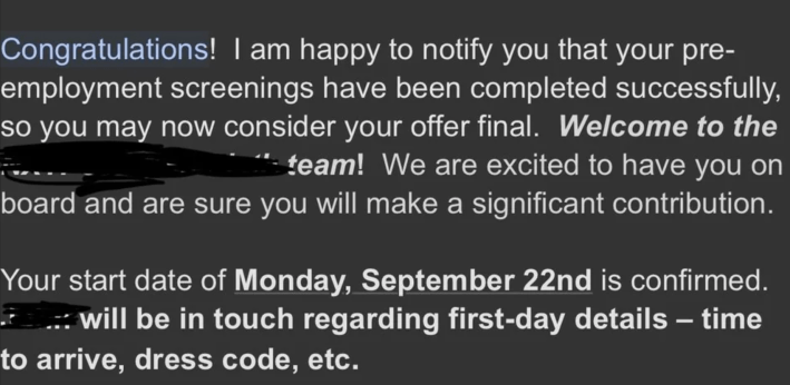 "Congratulations!" the email began. "I am happy to notify you that your pre-employment screenings have been completed successfully, so you may now consider your offer final."