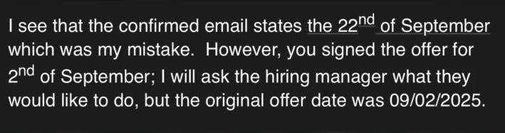 In another post, u/Alice14_VS admitted that her initial offer letter listed "9/2/2025" as the start date, but the follow-up a few days later, fully laying her start date out as "Monday, September 22, 2025" made her assume the first had been a mistake.