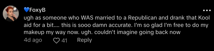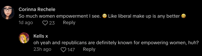"If you’re on TikTok you might have seen the far-left created 'Republican makeup' trend which was designed to take down women that don’t agree with their views," says X user @Carleemua. "All while actively calling themselves feminists."