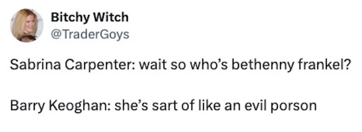 But it's a mostly good-natured one. The original tweet is about Carpenter asking Keoghan about his alleged role as the Joker and him misinterpreting her and replying...in an Irish accent.