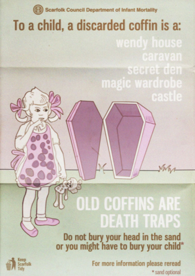 According to the Scarfolk Council blog, Scarfolk is a town in northwest England that is permanently stuck in the 1970s, reliving the decade over and over again. Like archaeologists investigating a long-dead culture, we are invited to inspect Scarfolk through the lense of various grotesque vintage posters, newsletters, and magazine covers.