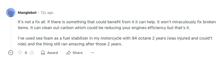 It’s also not a new hack. Sea Foam has been discussed and debated online for years, including on a post in the r/MechanicAdvice subreddit from 12 years ago. The consensus seemed to be that it was helpful, but didn’t solve problems on a broader scale beyond simple cleans, and that it was prone to causing smoke, with many posters recommending not cleaning your car in a busy neighborhood.