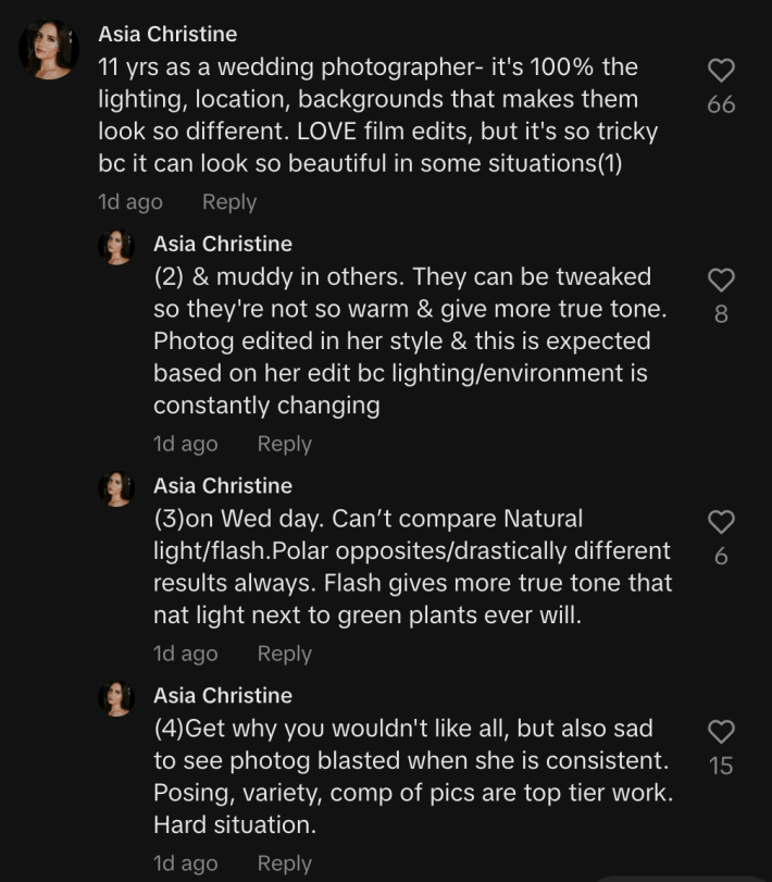 Photographer @asiachristine_ shared her own take on the photos, saying, “11 yrs as a wedding photographer- it's 100% the lighting, location, backgrounds that makes them look so different. LOVE film edits, but it's so tricky bc it can look so beautiful in some situations & muddy in others. They can be tweaked so they're not so warm & give more true tone. Photog edited in her style & this is expected based on her edit bc lighting/environment is constantly changing on [wedding] day.”