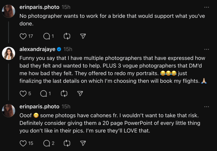 But the story doesn’t end on TikTok, as the drama of her wedding photos spread out to Threads, where @hannahreed.co asked, “I wonder if sepia bride knows her drama has left TikTok and is now being widely discussed over here on threads…And that we’re all team photog 😂”