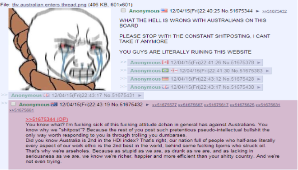 Shitposts are produced at irrational rates, and I use the passive voice intentionally, as shitposts wing into existence through no true effort but that dull minimum required to say something stupid on social media or screenshot someone else’s shitty remark. The manufacturing of shitposts is, in fact, the sharing of shit, of turning it viral and inflicting it upon everyone else. It is the pestilent communication of sheer attention to ephemera that ought to give us pause. If we do not happen to witness the worst of the internet, anonymous antagonists bring it to us.