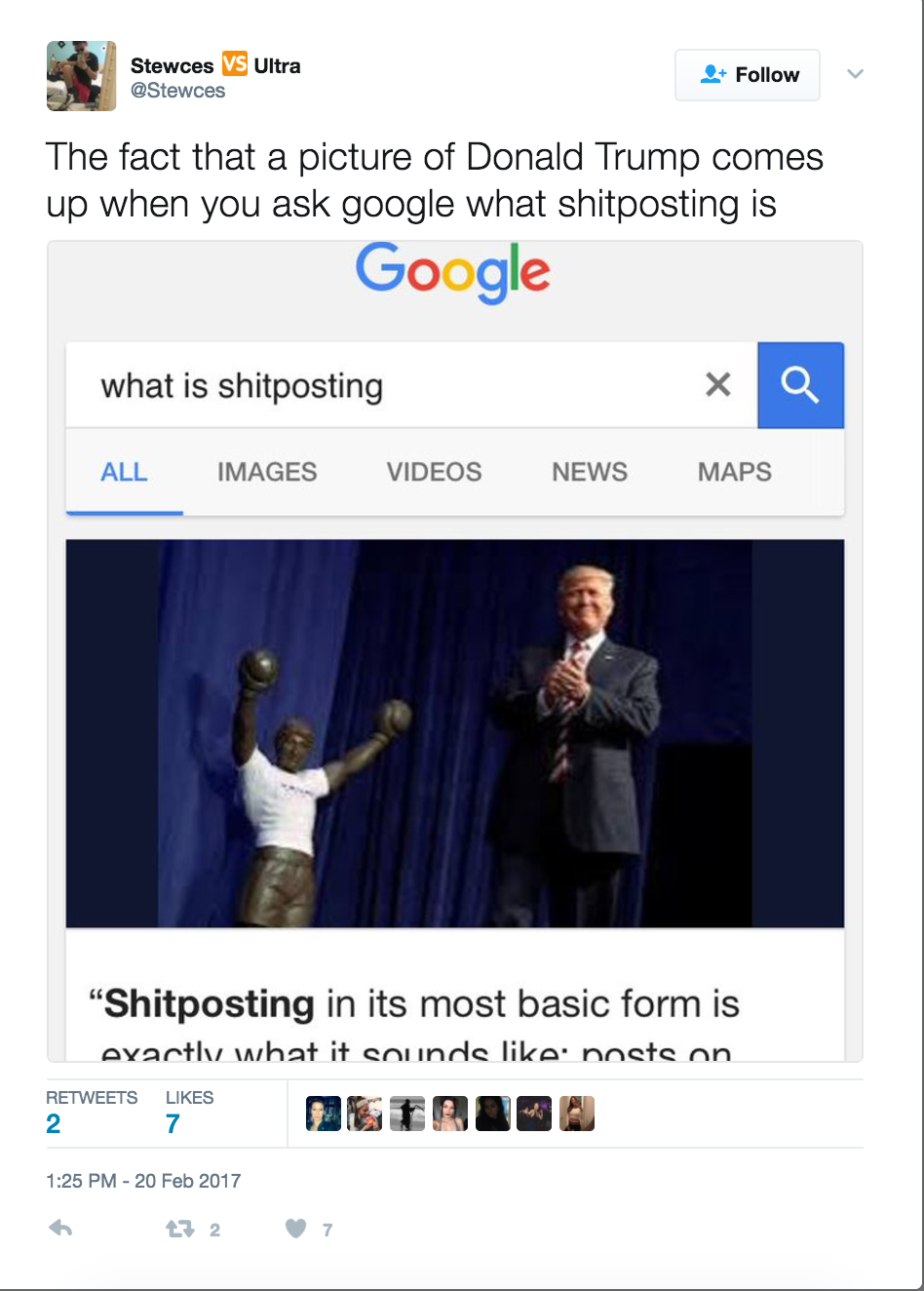 President Trump is, indeed, the perfect avatar of this only half-digital phenomenon. Ever uninformed and at pains to sound in cool command of the subject at hand, he offers an indecipherable casserole of the dozen nouns and four adjectives he can recall at any given moment. It’s the same brand of shit shoveled by his supporters onto Twitter, Reddit, and Facebook, many of them openly prizing his toxic indifference above his actual principles (such as they aren’t). This cynical pursuit of mayhem and disregard for consequence is a crucial aspect of shitposting; a shitpost is its own raison d'être, an island of trash for nobody.