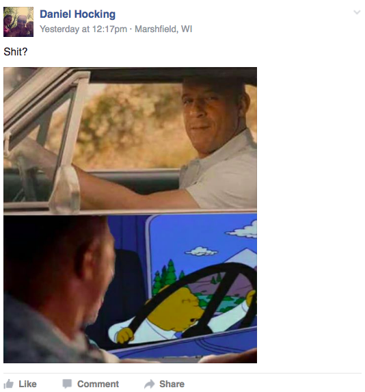 Then there's Simpsons Shitposting, a Weird Facebook group with a staggering 150,000-plus members. It might be simplest to explain the page as a place for Simpsons memes, but that doesn't quite speak to the essence of "shitposting," which encompasses content of aggressively, ironically, and trollishly poor quality. Incoherent jokes, hasty Photoshopping, mashups, irrelevance, errors in spelling or grammar—all are hallmarks of the shitpost, as seen below: