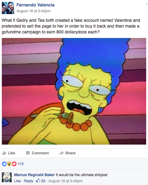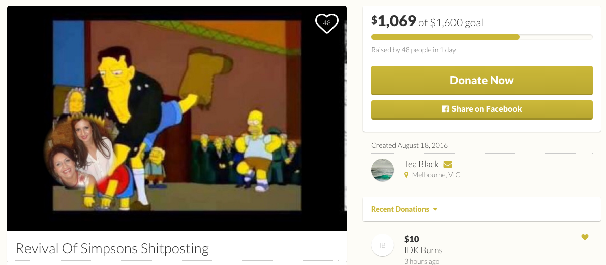 In the end, order was seemingly restored by a Simspons Shitposter known as Tea Black, who claimed they had bought the page back from the Macedonians for $1,200 (or 1,200 "dollarydoos," as any fan of the classic episode "Bart vs. Australia" would say). The same user set up a GoFundMe to recoup that fund, and shockingly enough, over $1,000 has been raised.