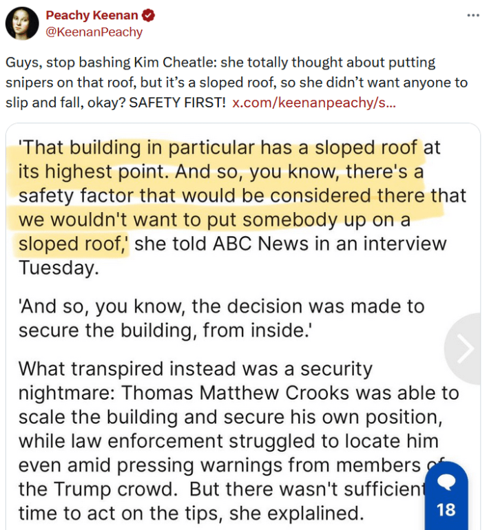 "Guys, stop bashing Kim Cheatle: she totally thought about putting snipers on that roof, but it’s a sloped roof, so she didn’t want anyone to slip and fall, okay? SAFETY FIRST!"