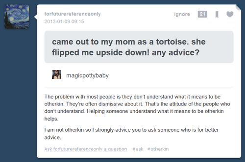 “I find it so utterly absurd that a movement whose original purpose was to defend the rights of POC, trans individuals, and other oppressed groups has been co-opted by people who believe they are dragons or that they have Homestuck characters living inside their head. It’s hilarious to me. It’s also incredibly offensive.”