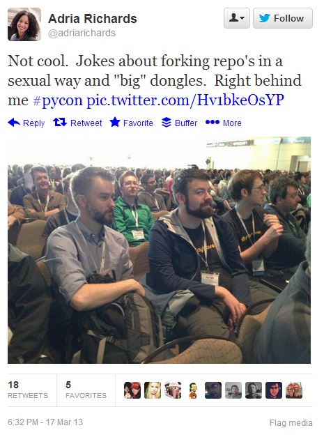 At this weekend's programming conference PyCon, developer evangelist Adria Richards overheard a sexual joke about "big dongles" and tweeted a photo of the laughing attendees behind her. She forwarded the image to PyCon staff along with a link to the event's code of conduct.