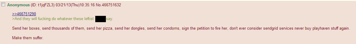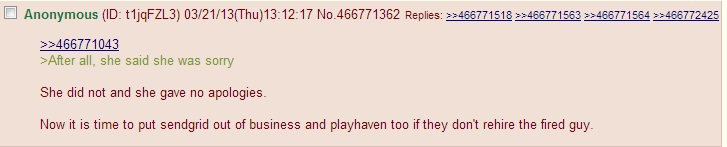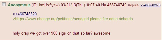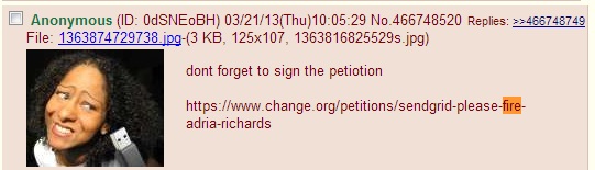 Users locked Richards, PlayHaven, and SendGrid in their sights. Many urged others to sign a petition calling for Richards's firing, and seemed to delight when SendGrid suffered from outages in the face of an apparent DDoS attack. The thread's goal: to ruin Richards's life.