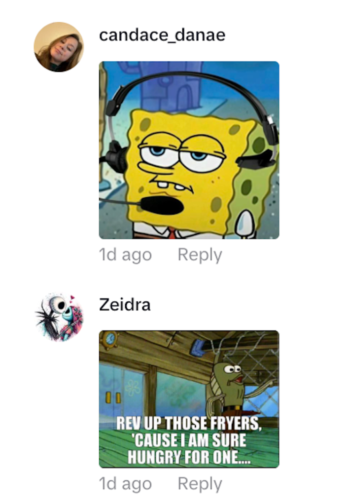 Another TikToker, @lisimersae, plays a clip from the show that says, "Rev up those fryers! 'Cause I am sure hungry for one Krabby Patty." The worker responds, "Okay," and tells the customer the order total.