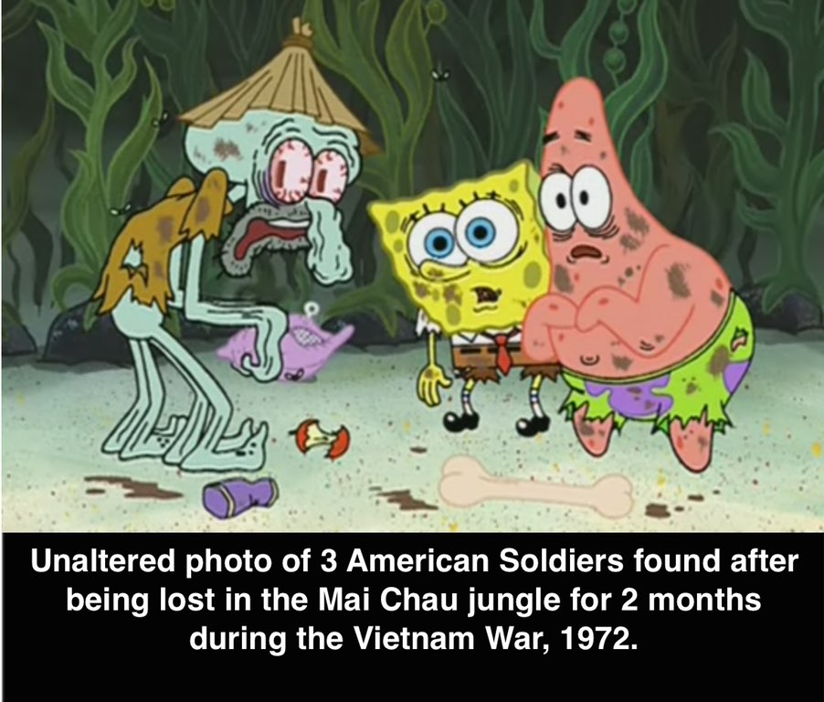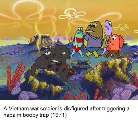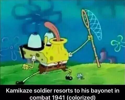 The premise of the joke is to juxtapose a children's cartoon about a talking sponge—albeit one with a lot of subtle adult jokes—with the real horrors of war. In the incongruity, there's some humor. When the photo matches the caption especially well—"when hte meam is well executed"—Spongbob History is good. Most often, though, it feels like an exercise for "edgelords," those online teens (or teens in adult bodies) who aim to shock and disturb, but tend to bore instead.