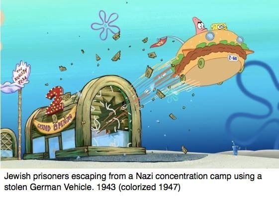 Spongebob History combines stills from the undersea cartoon with historical photo captions, most from grisly and horrible events. It's kind of a spongified answer to the many popular Twitter accounts—both sincere and fraudulent—that traffic in old photographs. It also has an element of History Channel to it—specifically, a fixation on Nazi Germany.