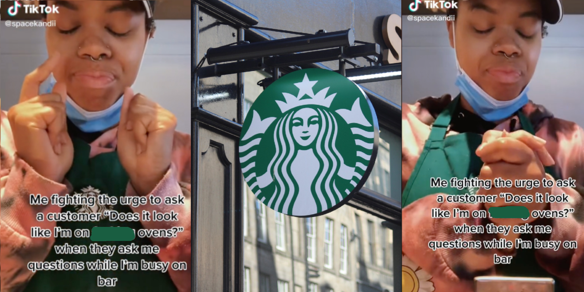 “Me fighting the urge to ask a customer, ‘Does it look like I’m on fucking ovens?’ when they ask me questions while I’m busy on bar,” the user, @spacekandii, wrote via text overlay on the video.