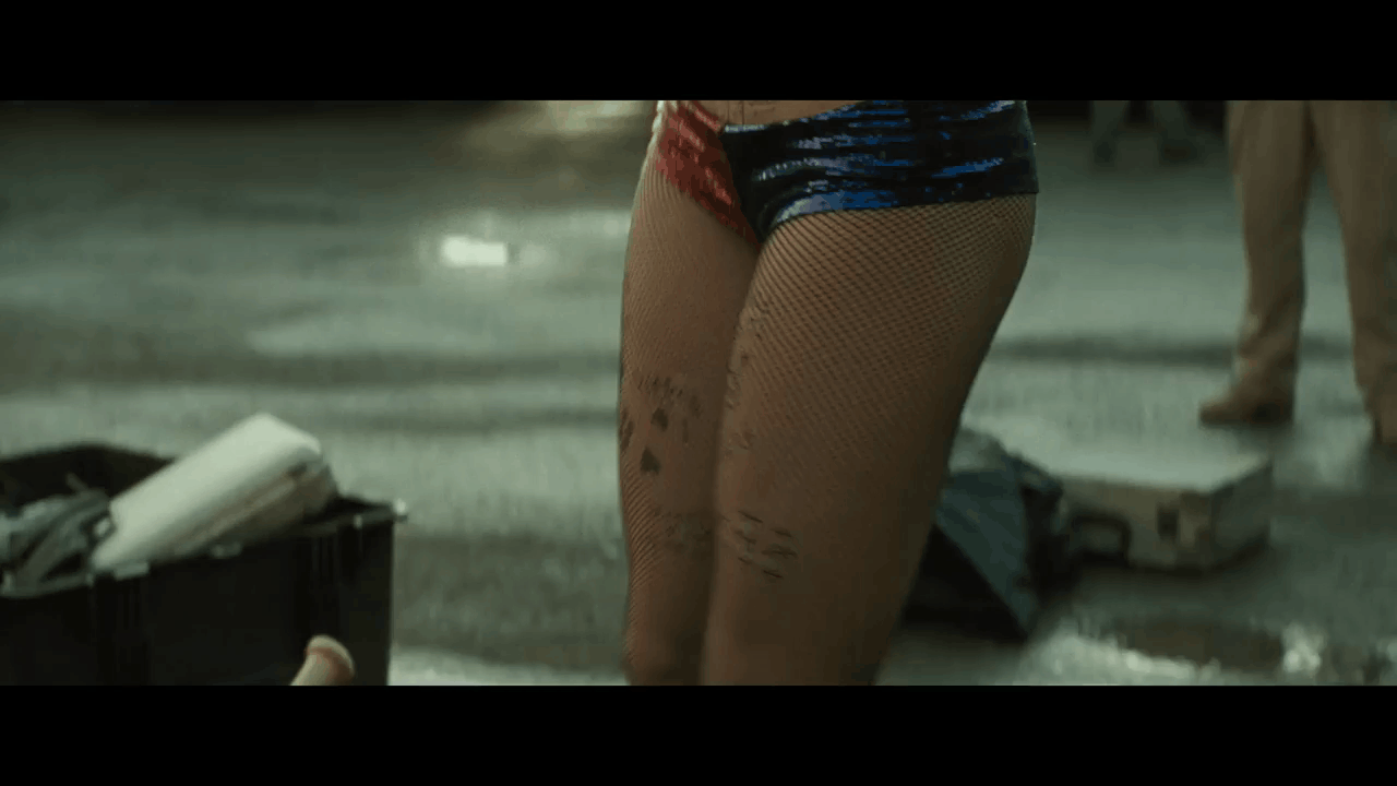 Meanwhile in Suicide Squad, Harley is introduced by a team of guards visiting her cell at Belle Reve, where she's performing some kind of prison-themed burlesque act. When she meets the rest of the Squad for the first time, her teammates suit up for battle while she strips down to a red bra—a shot that was heavily showcased in the film's trailers and played up with a full body pan.