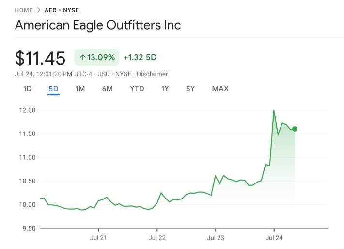 American Eagle's faith in Sweeney was reflected back at them. Stock prices began to rise immediately after the news broke Thursday morning, seeing a spike in the aftermarket hours and still performing at a notably higher rate than earlier in the week as of Friday.