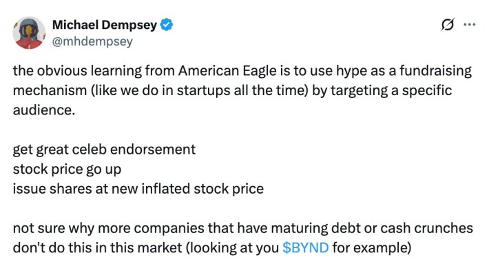 american eagle stock up 28% today. the public market equivalent of product market fit right now is cultural meme fit.