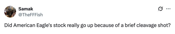 “So a bunch of the guys on FinTwit got super bulled up on American Eagle after Sydney Sweeney became their new spokesperson. Now the stock is ripping after hours haha. They say it’s actually pretty undervalued.”