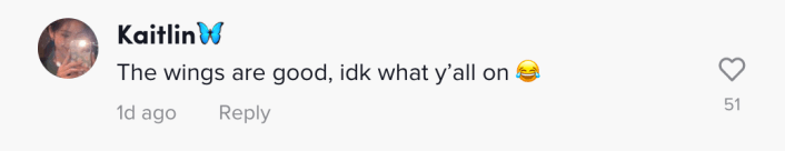 TikTok user Jewel (@jewel_shanay) posted her own video of the chicken wings, captioning it, "what da fuck is thisssss." Although her caption appeared uncertain, she said in the comments that she's a fan of the new menu item.