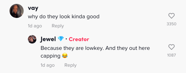 In response to a viewer asking why the wings actually look good, Jewel wrote, "Because they are lowkey. And they out here capping."