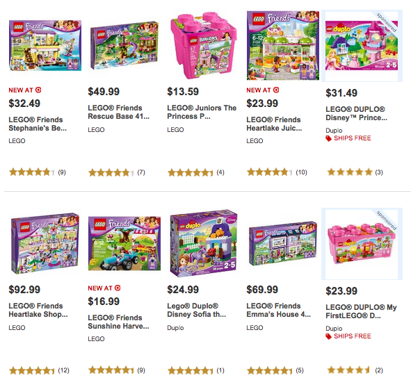 A look at the building sets page on Target’s website reveals a “gender” categorization option. There are 340 items for boys, 65 items for girls, and 235 identified as gender neutral. Similarly, Kmart offers 170 items for boys, 30 for girls, and 407 unisex. Toys R’ Us and Amazon also divide their offerings this way, while Walmart surprisingly does not.