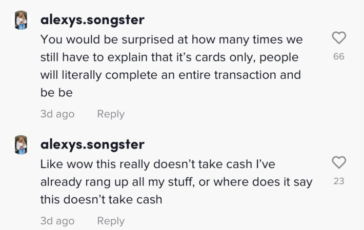 "You would be surprised at how many times we still have to explain that it's cards only, people will literally complete an entire transaction and be like wow this really doesn't take cash, I've already rang up all my stuff, or where does it say this doesn't take cash," they wrote.