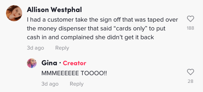 "I had a customer take the sign off that was taped over the money dispenser that said 'cards only' to put cash in and complained she didn't get it back," the commenter wrote.