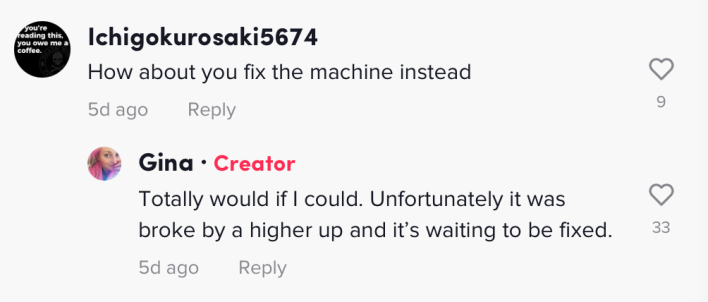 "Totally would if I could," she responded. "Unfortunately it was broke by a higher up and it's waiting to be fixed."