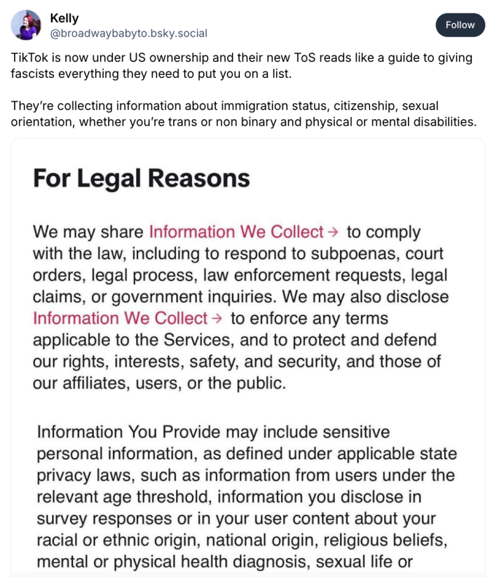 "Especially for trans folks. It straight up says in the new ToS that they—Oracle, the company that has active ties to the Trump admin—are monitoring and documenting trans and NB users."