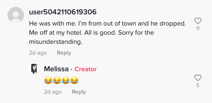 "He was with me," they wrote. "I'm from out of town and he dropped me off at my hotel. All is good. Sorry for the misunderstanding."
