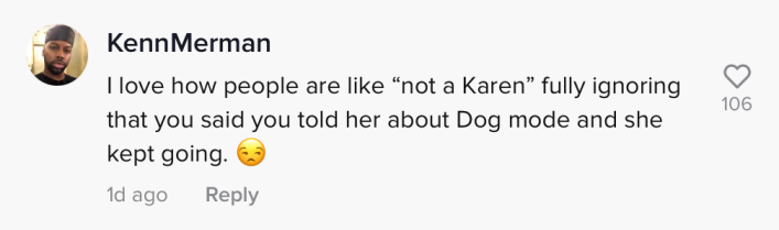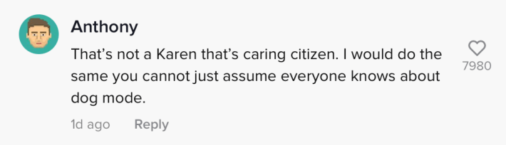 "That's not a Karen that's [a] caring citizen," one commenter wrote. "I would do the same you cannot just assume everyone knows about dog mode."