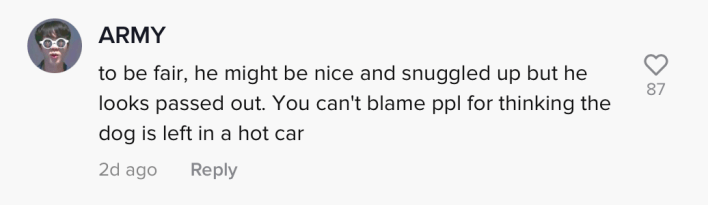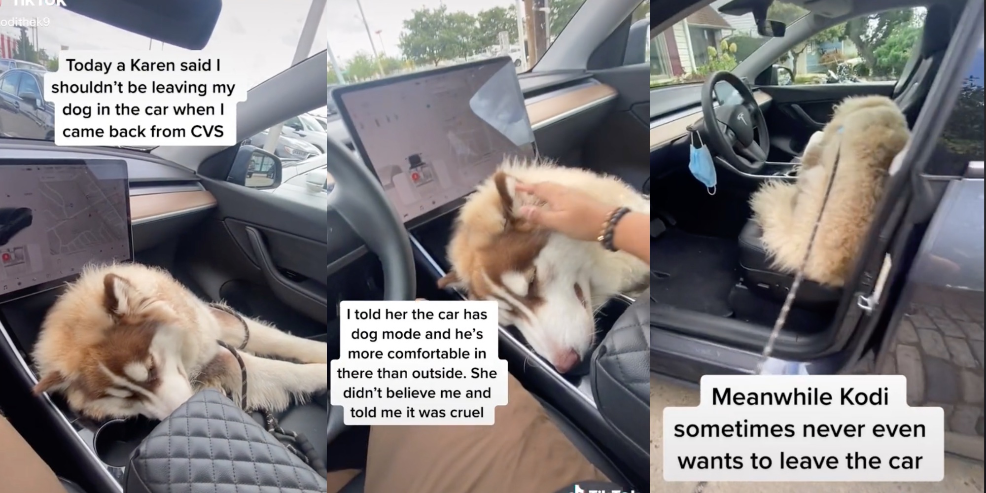 "Today a Karen said I shouldn't be leaving my dog in the car when I came back from CVS," text overlay on the video reads. "I told her the car has dog mode and he's more comfortable in there than outside. She didn't believe me and told me it was cruel. Meanwhile Kodi sometimes never even wants to leave the car."