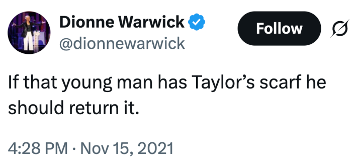 "Dionne Warwick speaking her piece about the all too well drama is soooo funny. i will pay the cost of postage, Jake." —u/angelonthefarm