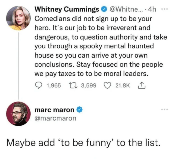 Whitney Cummings: "Comedians did not sign up to be your hero. It's our job to be irreverent and dangerous, to question authority and take you through a spooky mental haunted house so you can arrive at your own conclusions. Stay focused on the people we pay taxes to to be moral leaders."