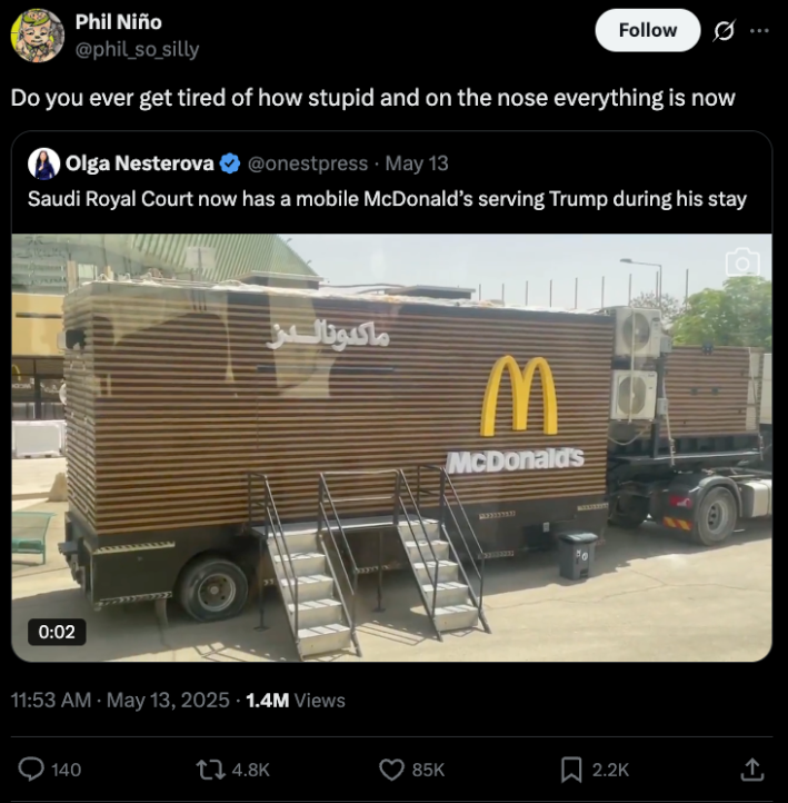 Saudi Royal Court now has a mobile McDonald’s serving Trump during his stay pic.twitter.com/Nk5HZitAae