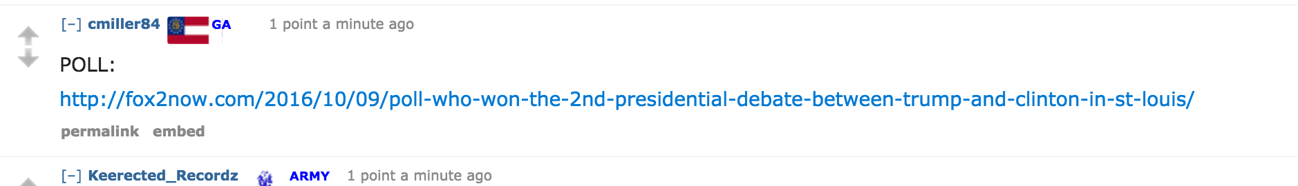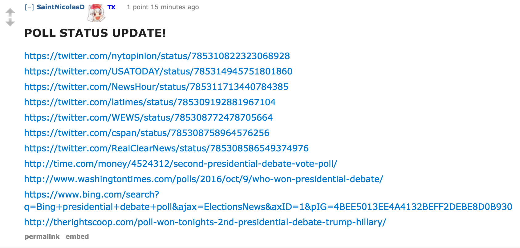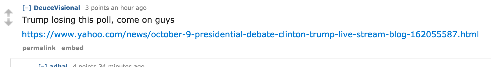 The message clearly resonated on r/The_Donald, turning the thread into a lively hub for live reactions to the debate. It received more than 17,000 comments in just four hours. As the closing arguments took place, users were clamoring for links to polls, specifically those that are susceptible to various forms of manipulation, like vote brigading and botting.
