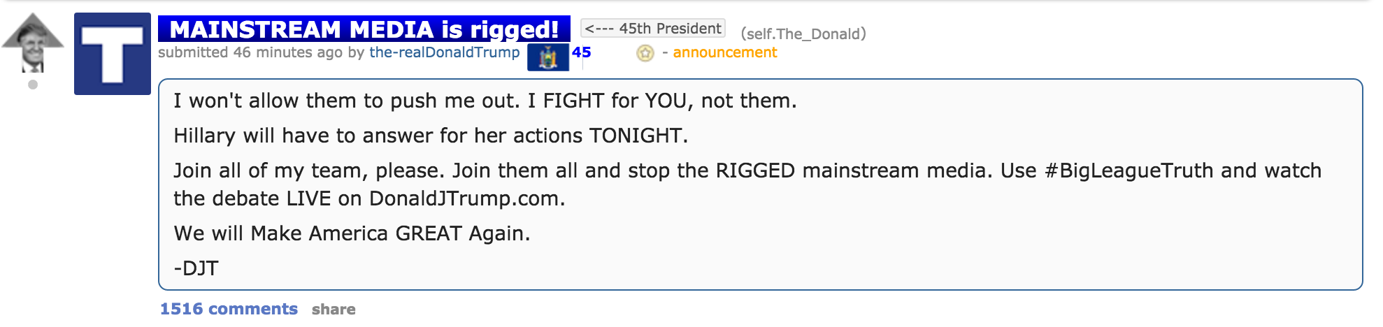 Trump left a brief message on the forum Sunday night, mere minutes before taking the stage. It was titled “MAINSTREAM MEDIA is rigged!,” a message that he attempted to underscore in his banter with the debate moderators throughout the course of the evening. (Trump also posted to the forum before the vice presidential debate and previously took part in an AMA, or “Ask Me Anything,” interview session on the site.)