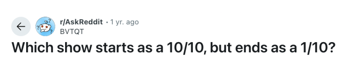 TV fans are not holding back in an Ask Reddit post that poses the question, "Which show starts as a 10/10, but ends as a 1/10?" The replies range from obvious choices such as Game of Thrones to classics like Happy Days, which inspired the TV term, "jumping the shark."