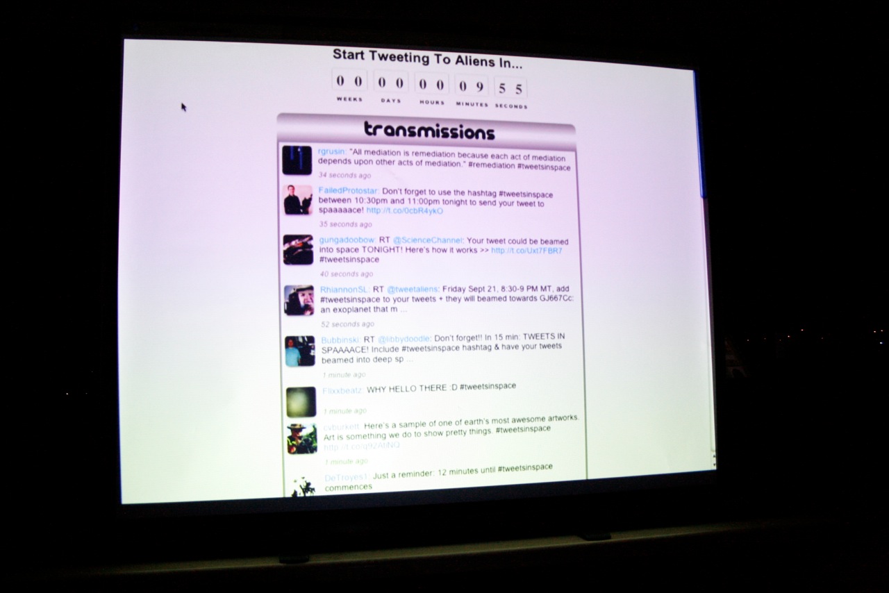 During an event held at the International Symposium on Electronic Art in New Mexico, Nathaniel Stern and Scott Kildall captured all tweets using the #tweetsinspace hashtag over a half-hour period. In  a few short weeks, the duo will beam the hundreds of messages they received to GJ667Cc, a planet some 22 light years away that has the capacity to support life.