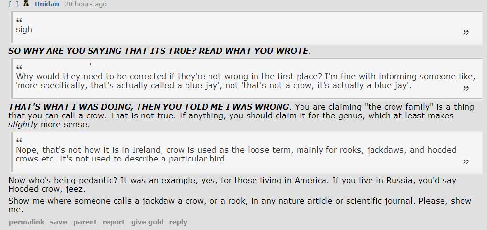 “I am not okay with that, that is why we are having this argument, remember?” Unidan responded. “The point is that you shouldn't refer to them all as crows. So if you see a video of a blue jay, and someone says ‘hey, look at this crow video!’ you wouldn't expect someone to correct them?”