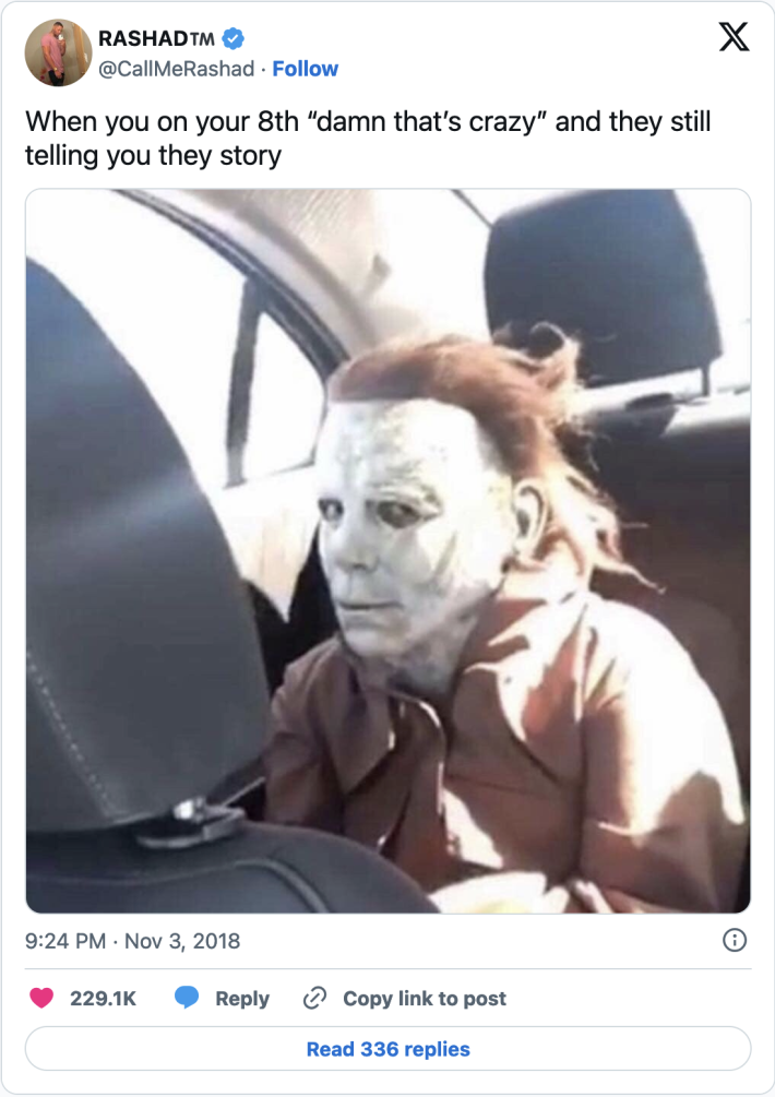 Although the film was reportedly scary enough to make moviegoers throw up and pass out in theaters, online, Art is emblematic of someone’s social clumsiness. His memes are used to punctuate any situation where someone stands out like a sore thumb, and has fully internalized their weirdness, or if someone or something is just being a little too extra.